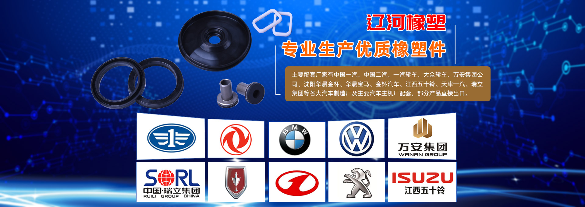 遼河集團主要生產各類汽車三角窗密封條、O形圈、油封、皮膜、皮碗、減震系列等各類橡塑密封件和汽車用橡膠制品,公司銷售網點遍布全國各地,目前已經為全國各大汽車制造廠及主要汽車主機廠配套各種橡膠制品。